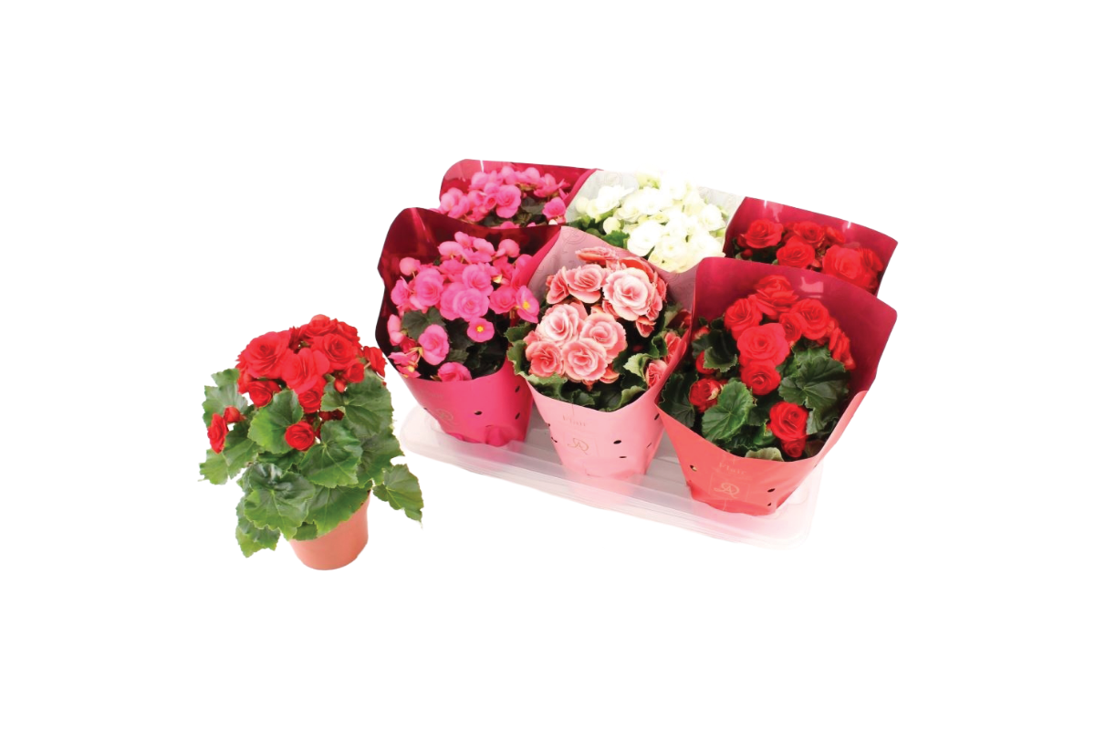 Sobna begonija z bujnimi, polnimi cvetovi v toplih rožnatih in rdečkastih odtenkih ter dekorativnimi, temno zelenimi listi. Idealna za lončke in svetle kotičke doma. Cveti dolgo in ob redni negi ohranja intenzivno barvo in bujno rast.