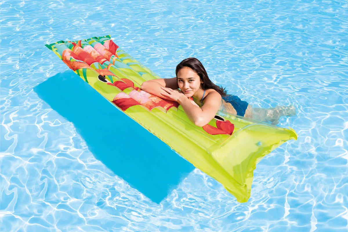 Dimenzije: 1,83 m × 69 cm 2 zračni komori Potisk na blazini: Coral fish, Flamingo, Flower Največja nosilnost: 100 kg Pakiranje: 24 kosov