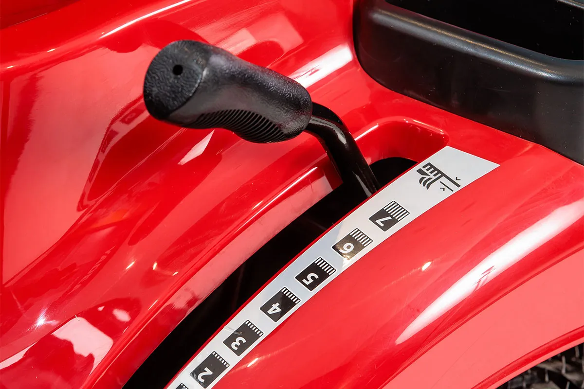 - Ergonomsko upravljanje in udobje – Voznikov sedež je zasnovan za daljše delo brez utrujenosti. Vsi Ergonomsko upravljanje in udobje – Voznikov sedež je zasnovan za daljše delo brez utrujenosti. Vsi upravljalni elementi (plin, zavora, menjalnik in ročica za nože) so ergonomsko razporejeni, kar olajša uporabo in povečuje varnost. - Zmogljiv in zanesljiv motor – Naprava je opremljena z motorjem moči 6,8 kW in prostornine 413 cm³, kar zagotavlja stabilno delovanje in dovolj moči za košnjo tudi go