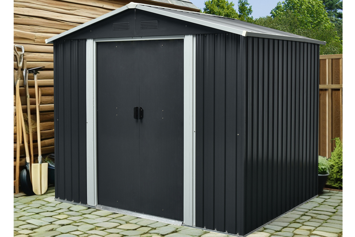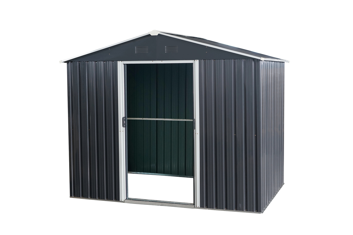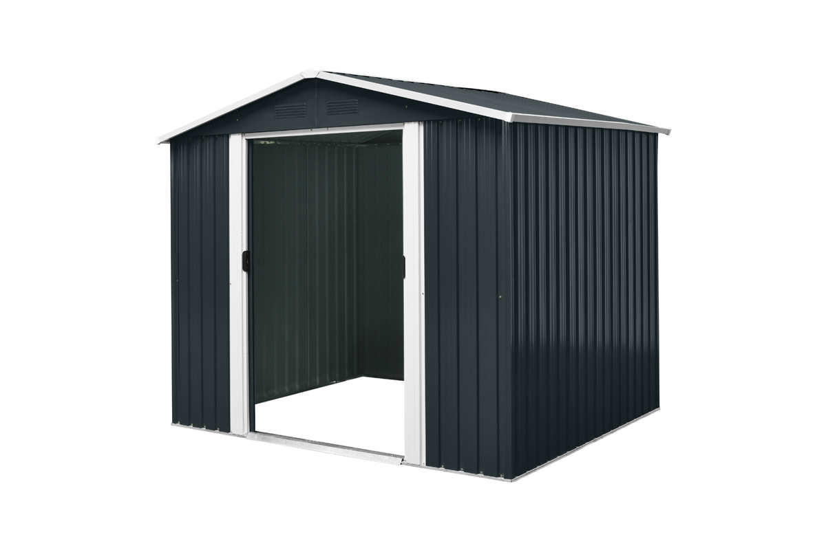 Dimenzije: 162 × 226 × 156 cm Material ogrodja: pocinkano jeklo 0,6 mm 0,25 mm prevleka iz pocinkanega jekla Streha s štirimi prezračevalnimi odprtinami Dvokrilna drsna vrata Dimenzije: 82 × 154 cm Dodatne ojačitve za stabilizacijo Kovinski temelj ni vključen v ceno