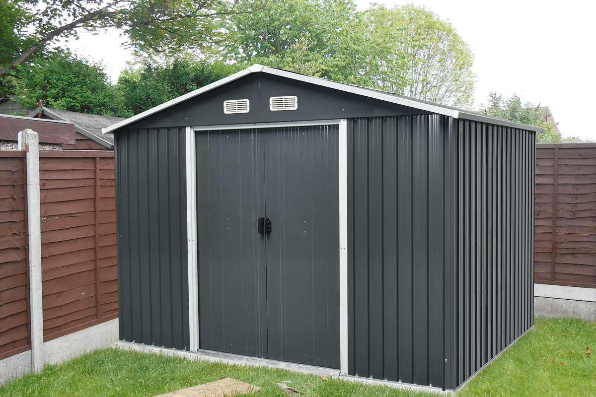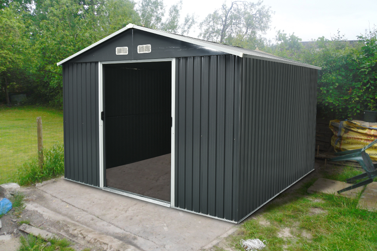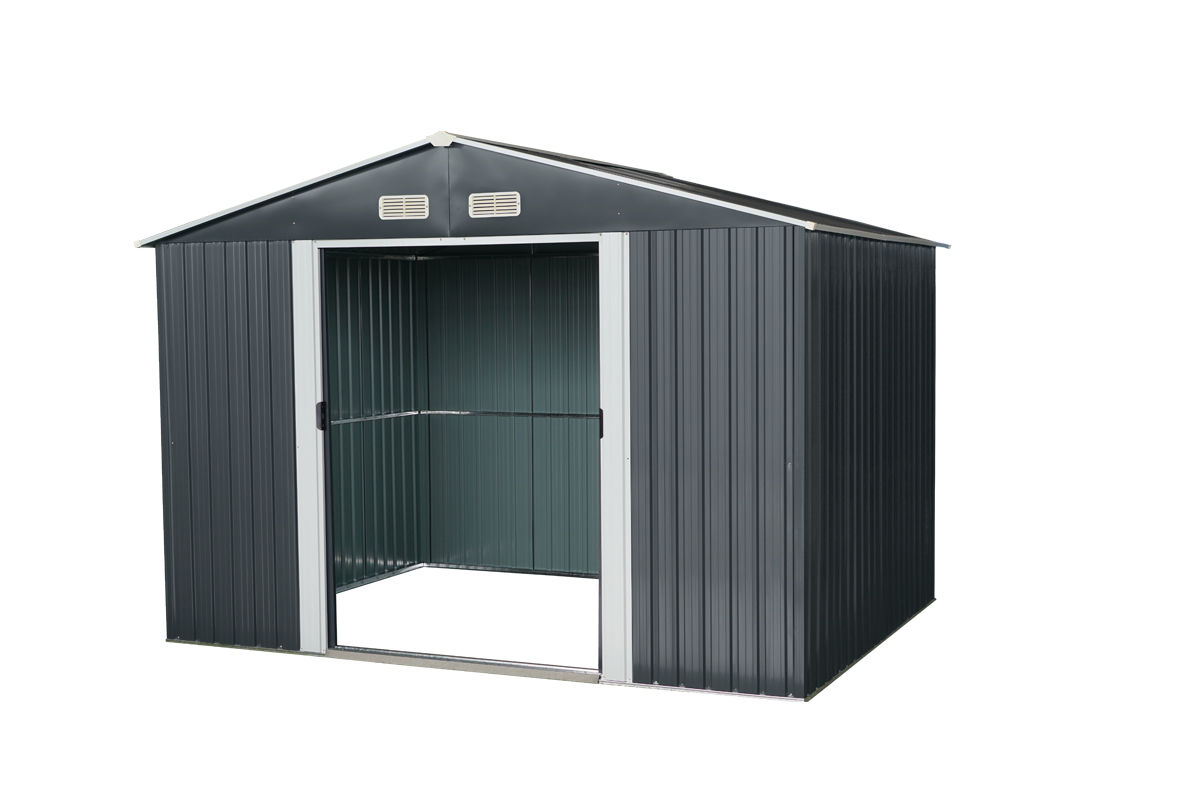 Dimenzije: 226 × 291 × 172 cm Material ogrodja: pocinkano jeklo 0,6 mm 0,25 mm prevleka iz pocinkanega jekla Streha s štirimi prezračevalnimi odprtinami Dvokrilna drsna vrata Dimenzije: 170 × 125 cm Dodatne ojačitve za stabilizacijo Kovinski temelj ni vključen v ceno