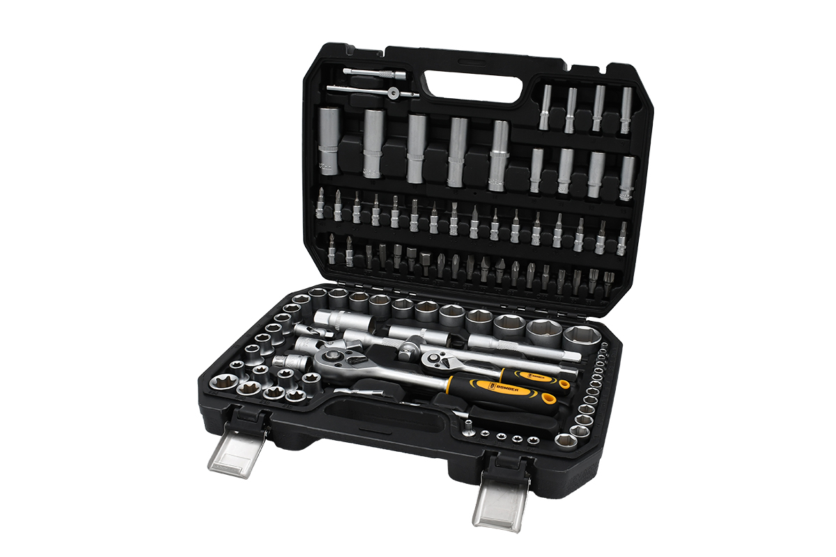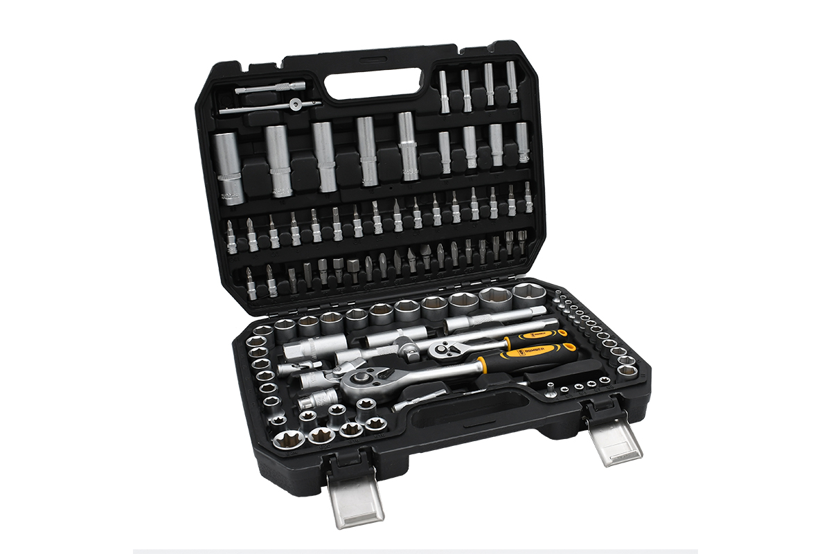 Ključa z 72 zobmi 2 kos ključa za svečke (1/2“, 16 in 21 mm) 1 kos trodelni adapter 13 kos nastavkov (1/4“, od 4 do 14 mm) 8 kos globokih nastavkov (1/4“, od 6 do 13 mm) 2 nastavka za nastavke (2 in 4“) 1 kos univerzalni spojnik (1/4“) 5 kos Torx nastavkov (1/4“, e4, e5, e6, e7, e8) 1 kos drsna T ro