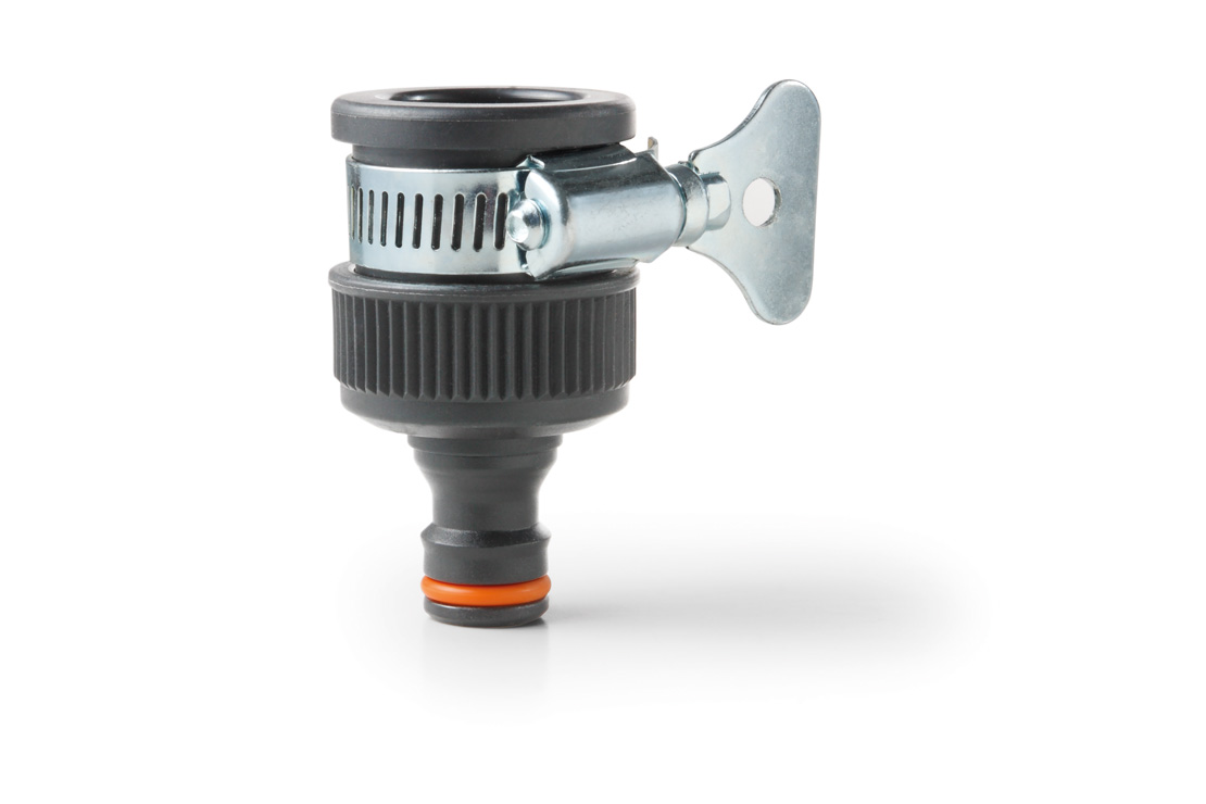 Priključek za pipe brez navoja s kovinsko objemko in krilnim vijakom za varno uporabo.