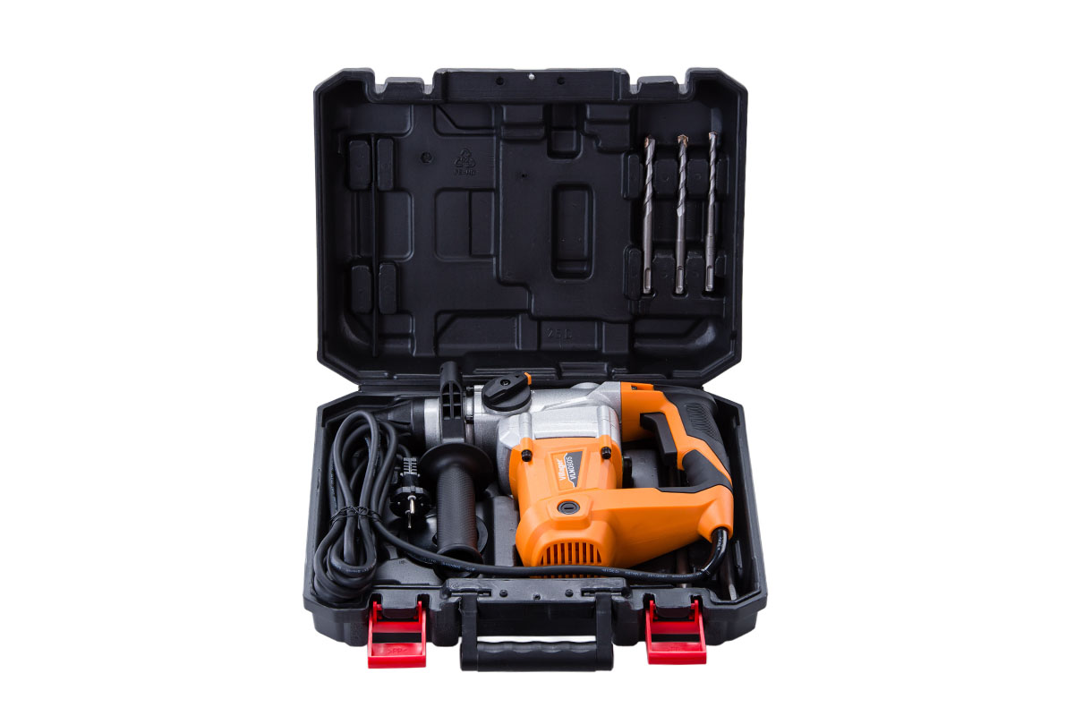 - Nastavljiv ročaj - Omejilnik globine - Set svedrov in dleta - Kovček