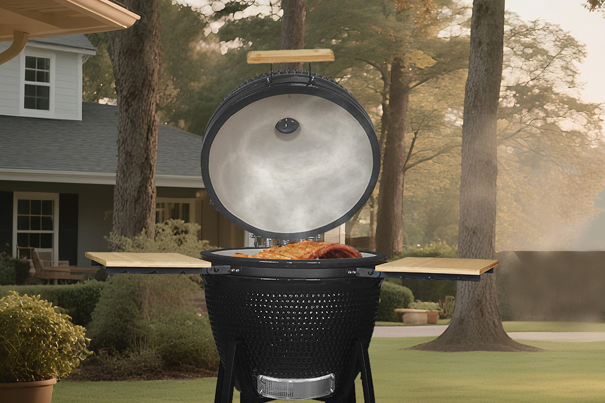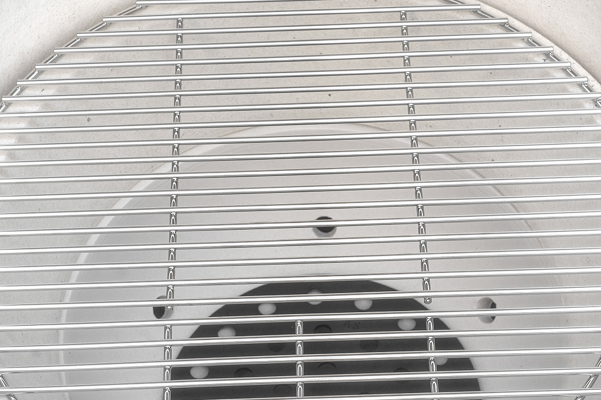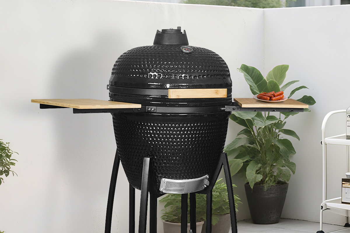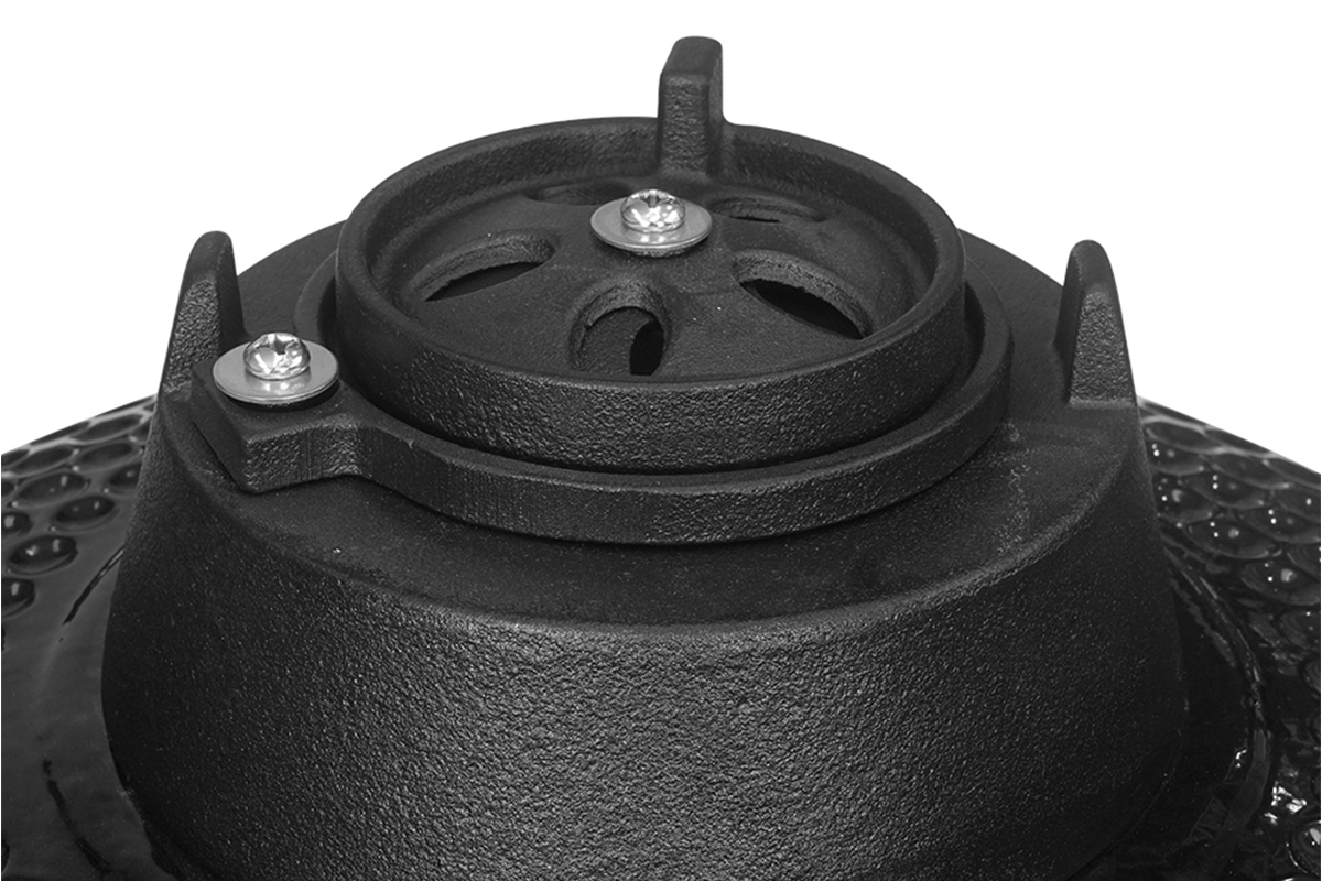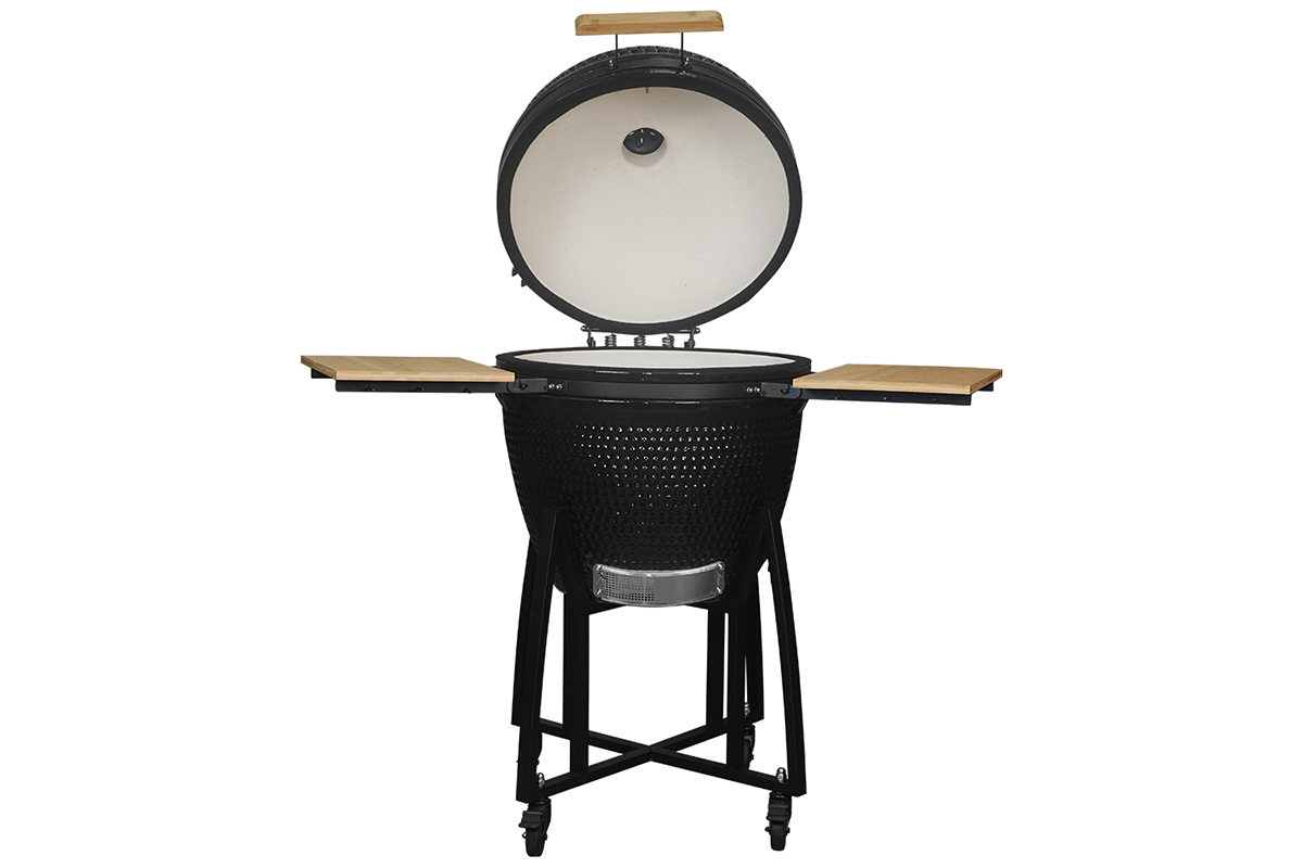 Premer žara: Ø 59,5 cm / 23,4 Premer rešetke: Ø 51,5 cm Zgornji ventil: litoželezo Stranska miza/ročaj: bambus Podstavek žara: jeklo Premer kuhalne rešetke: 6 mm Material žara: mulit Kupola žara: mulit Mulit, znan tudi kot porcelanit, je silikatni material, ki se pojavlja v obliki iglic znotraj porcelana. Mulit se šteje za ognjevarni material, ki ohranja svojo obliko in trdnost pri zelo visokih temperaturah. Odporen je do 1000 °C.